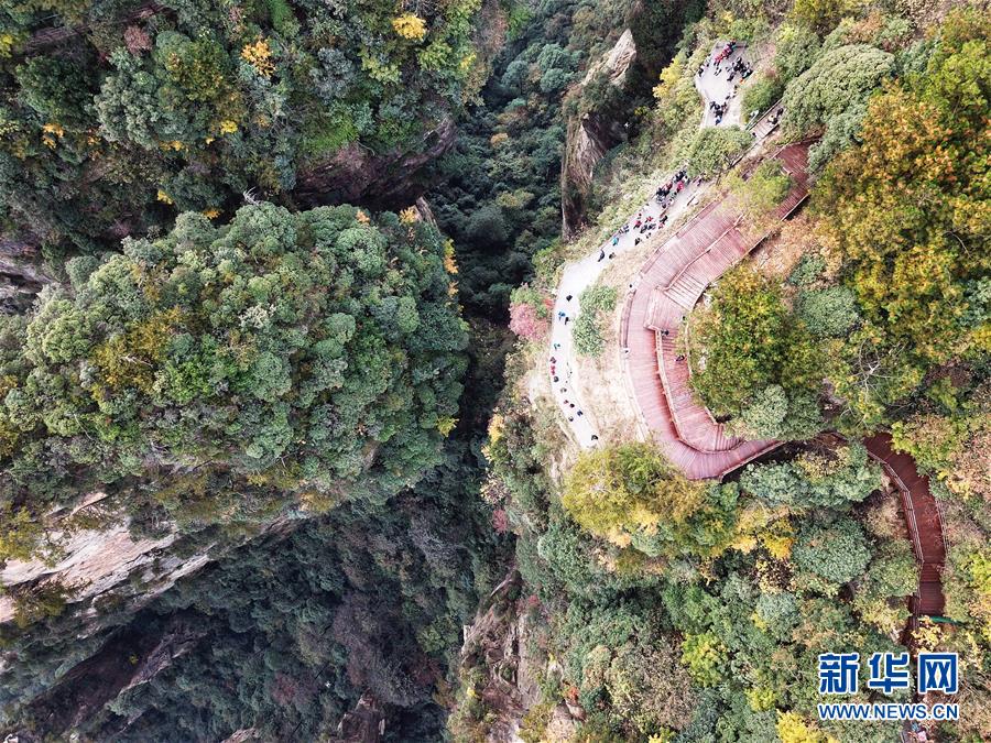 使用无人机航拍的张家界武陵源秋色(11月4日摄)。湖南张家界武陵源有着“大自然迷宫”“天下第一奇山”等美誉,被地质学家称为“地球的纪念物”,景区内沟壑纵横,千峰耸立,它与北京箭扣长城、福建土楼等十处景区被航拍专家等推选为中国“最美航拍目的地”。新华社记者 邢广利 摄